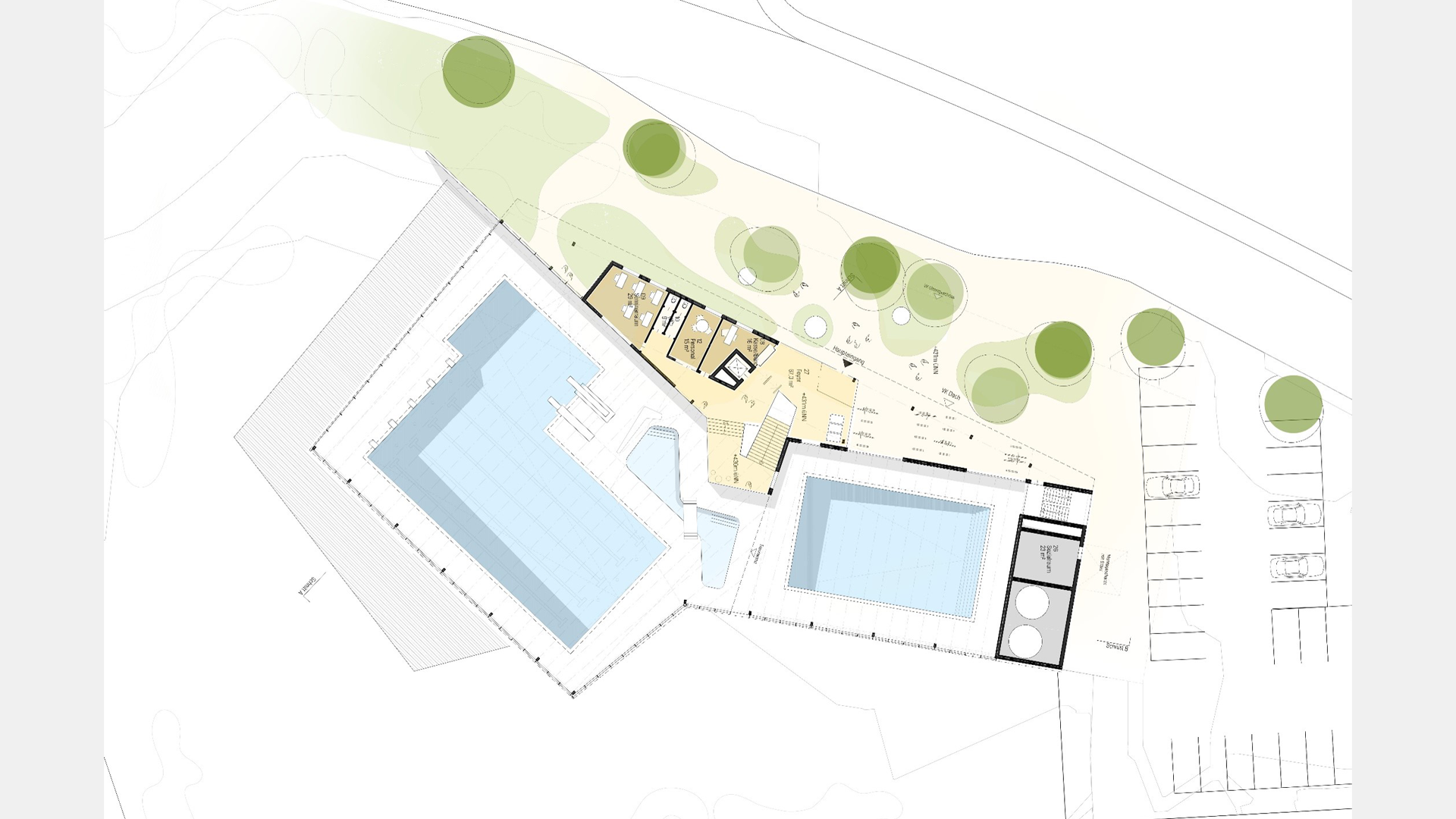 Aufgrund der Hanglage befindet sich die Umkleide- und Badeebene auf Höhe des Stadtparks und öffnet den Blick durch eine Vielzahl alter Bäume in Richtung Filderhalle. Das Schwimmangebot umfasst ein 25m Schwimmbecken mit 5 Bahnen, ein Sprungbecken mit 1m und 3m Sprungturm, ein Lehrschwimmbecken mit einer Wasserfläche von 16,66m x 10,90m sowie ein Kleinkindbecken mit Spielattraktionen. Das Dachtragwerk wird als sichtbaren Holzkonstruktion ausgeführt.