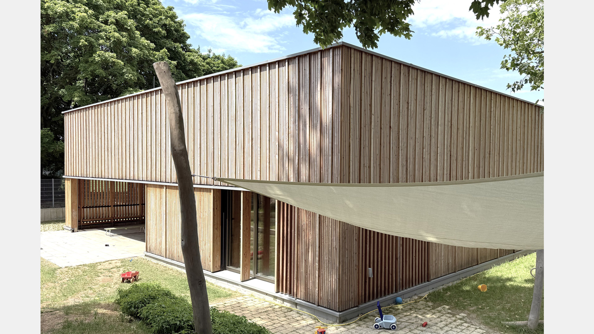 Auf einer Stahlbetonbodenplatte wird die Kita in Holzbauweise errichtet. Die tragenden Wände werden in Holzständerbauweise und die Geschossdecken in Massivholz ausgeführt. Zur Aussteifung dient ein Stahlbetonkern, welcher die vertikale Erschließung aufnimmt. Sämtliche nichttragenden Innenwände werden als Trockenbaukonstruktionen errichtet. Die Außenfassade der Kita wird mit vertikalen Holzlamellen verkleidet, die Fenster werden als Holz-Alukonstruktion vorgesehen.