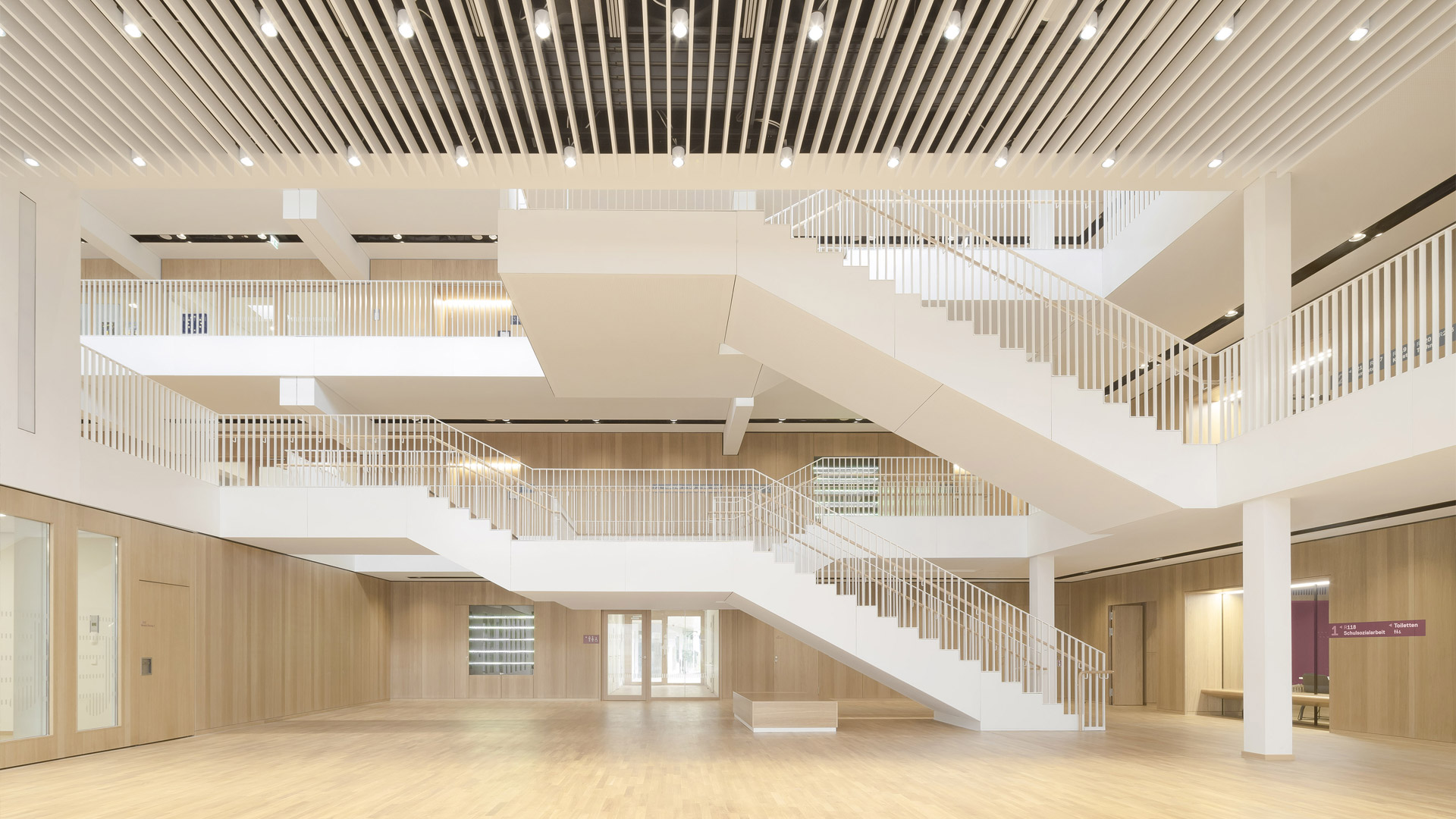 Schüleraufenthalt und Fachklassen sind über Galerien erschlossen. Hierfür wird die vorhandene Baustruktur verwendet. Die Pausenhalle öffnet sich auf der Ostseite großzügig zum terrassierten Schulhof.