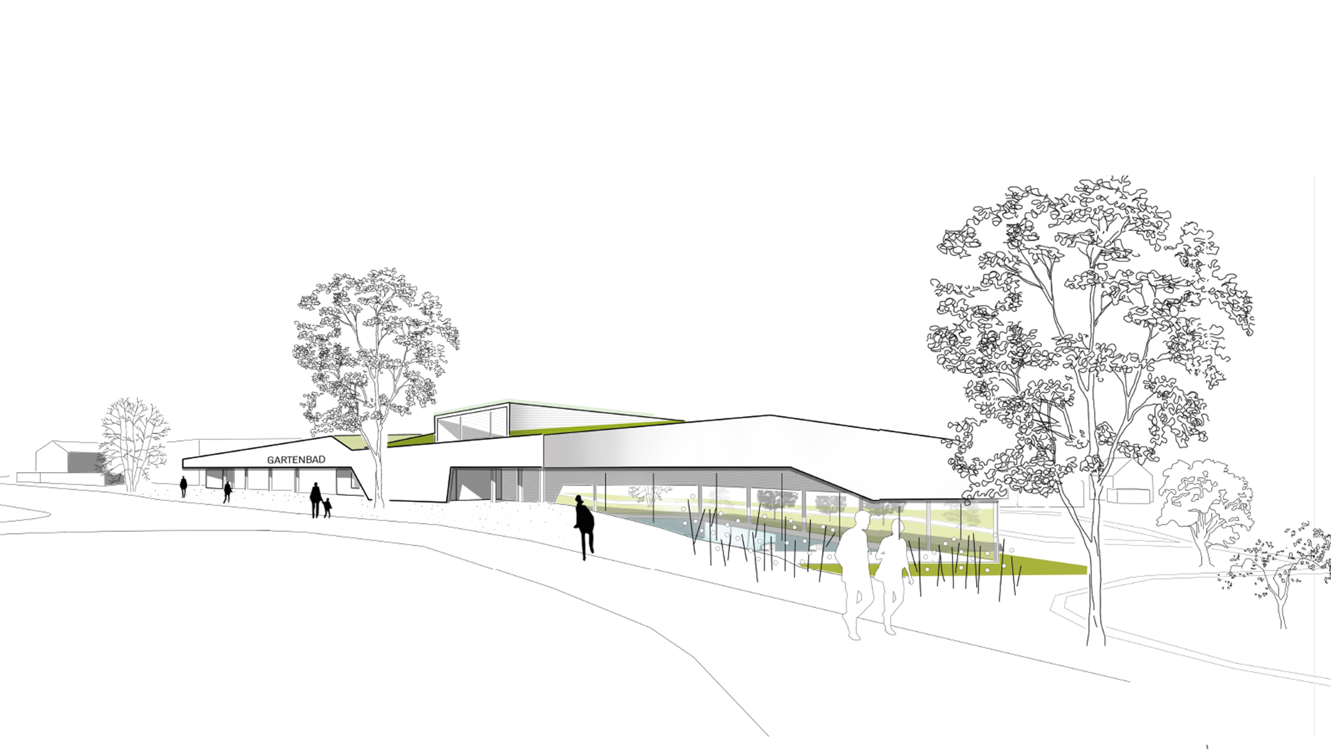 Aufgrund der Hanglage befindet sich die Umkleide- und Badeebene auf Höhe des Stadtparks und öffnet den Blick durch eine Vielzahl alter Bäume in Richtung Filderhalle. Das Schwimmangebot umfasst ein 25m Schwimmbecken mit 5 Bahnen, ein Sprungbecken mit 1m und 3m Sprungturm, ein Lehrschwimmbecken mit einer Wasserfläche von 16,66m x 10,90m sowie ein Kleinkindbecken mit Spielattraktionen. Das Dachtragwerk wird als sichtbaren Holzkonstruktion ausgeführt.