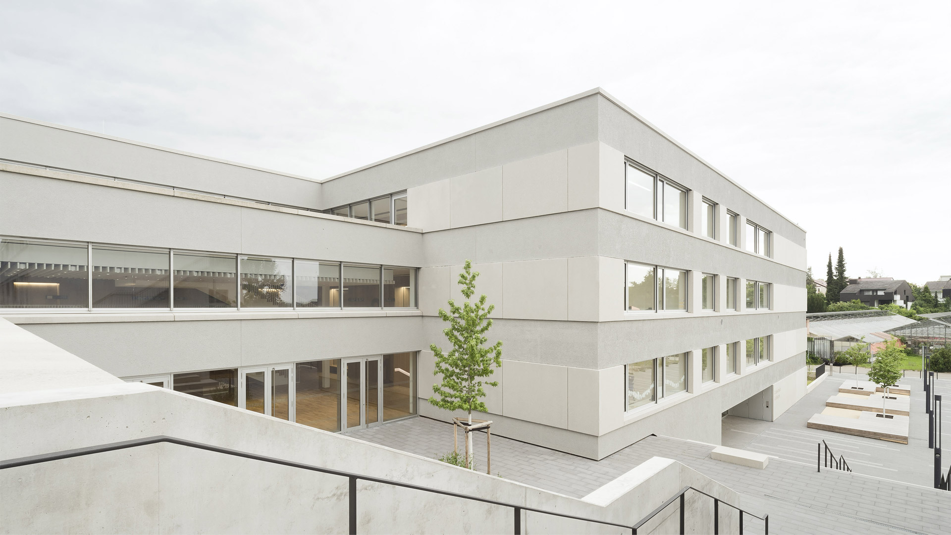 Schüleraufenthalt und Fachklassen sind über Galerien erschlossen. Hierfür wird die vorhandene Baustruktur verwendet. Die Pausenhalle öffnet sich auf der Ostseite großzügig zum terrassierten Schulhof.