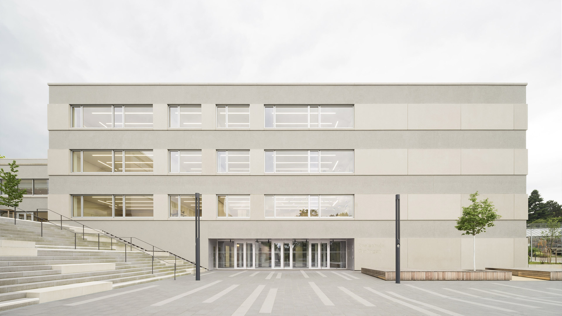 Die Stadt Gerlingen hat die bestehende Realschule von 2,5 auf 3 Züge erweitern und umfassend saniert. In diesem Kontext soll auch das bestehende Schulzentrum um eine Mensa ergänzt werden. Innerhalb des Schulzentrums definiert die Realschule einen klar ablesbaren Ort für die Schüler. Der neue Eingang zur Realschule liegt barrierefrei erreichbar auf Geländeebene. Über ein Eingangsfoyer im Sockelgeschoss, das u.a. auch die Verwaltung beinhaltet, erreicht man die im darüber liegenden Geschoss liegende Pausenhalle mit Aulafunktion. Zur Halle hin öffnen sich auf der einen Seite die Zentralbereiche der Lerncluster und auf der anderen Seite der zuschaltbare Musikraum.